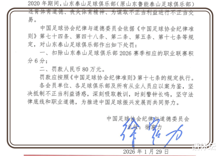 就像很多泰山队的球迷一样,看到这份处罚决定,第一感觉不是冤枉,而是新赛季争冠又泡汤了。